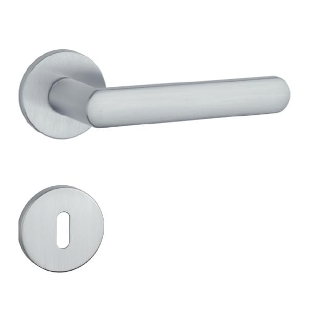 Rozetová klika na interiérové dveře s kulatou rozetou je vyrobena z materiálů vysoké kvality - zamak a je povrchově upravena. Rozeta má průměr 52 mm a tloušťku jen 7 mm. Minimalistický design rozety s vysokou stabilitou kliky na dveřích působí jemně, a tím ponechává prostor pro vyniknutí designu samotné kliky.
