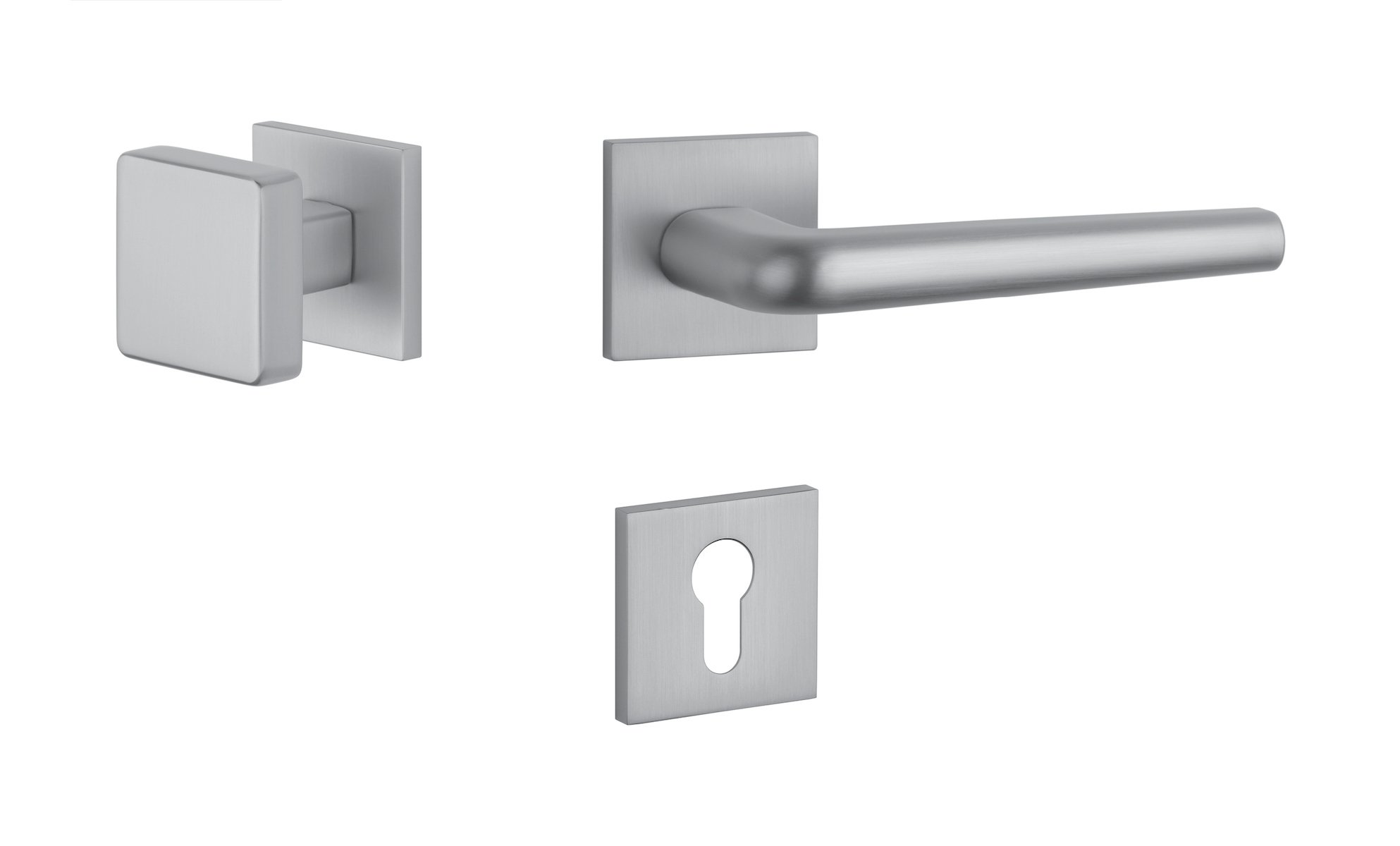 Rozetová klika na interiérové dveře s hranatou rozetou je vyrobena z materiálů vysoké kvality - zamak a je povrchově upravena. Rozeta má rozměr 52x52 mm a tloušťku jen 7 mm.