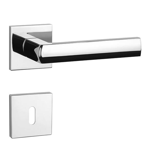 Rozetová klika na interiérové dveře s hranatou rozetou je vyrobena z materiálů vysoké kvality - zamak a je povrchově upravena. Rozeta má rozměr 52x52 mm a tloušťku jen 7 mm. Minimalistický design rozety s vysokou stabilitou kliky na dveřích působí jemně, a tím ponechává prostor pro vyniknutí designu samotné kliky.