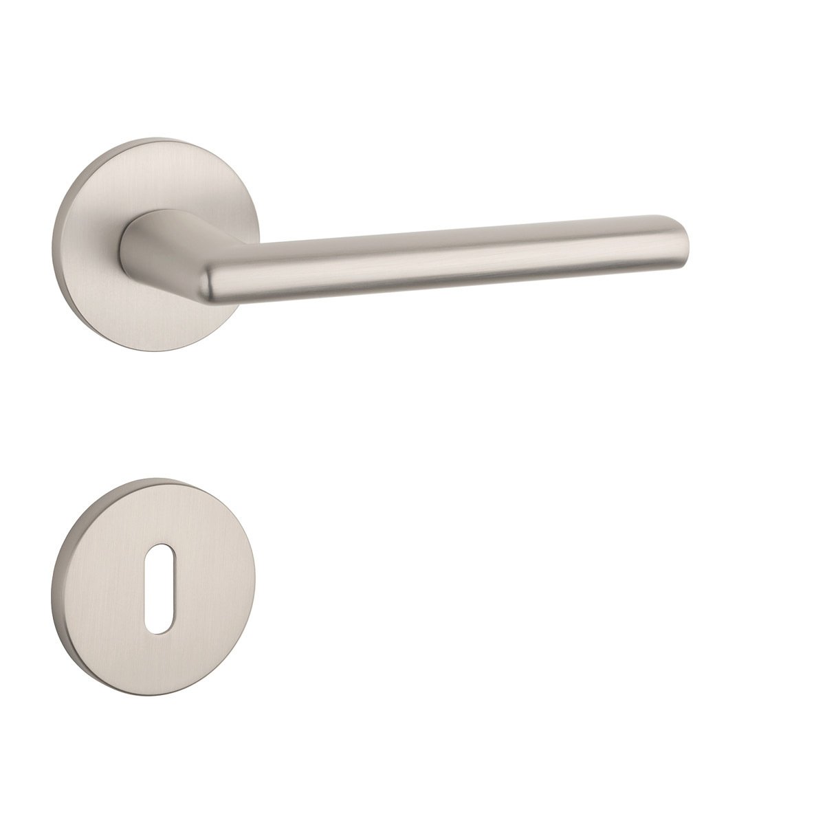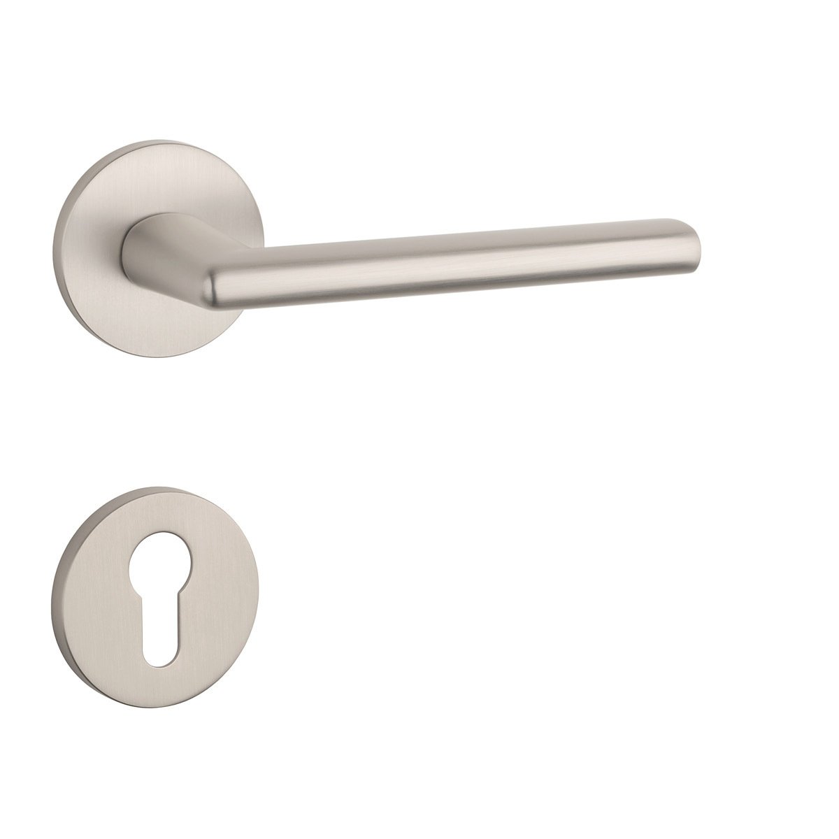 Rozetová klika na interiérové dveře s kulatou rozetou je vyrobena z materiálů vysoké kvality - zamak a je povrchově upravena. Rozeta má průměr 54 mm a tloušťku jen 7 mm. Minimalistický design rozety s vysokou stabilitou kliky na dveřích působí jemně, a tím ponechává prostor pro vyniknutí designu samotné kliky.