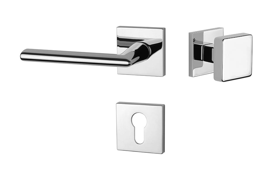 Rozetová klika na interiérové dveře s hranatou rozetou je vyrobena z materiálů vysoké kvality - zamak a je povrchově upravena. Rozeta má rozměr 52x52 mm a tloušťku jen 7 mm. Minimalistický design rozety s vysokou stabilitou kliky na dveřích působí jemně, a tím ponechává prostor pro vyniknutí designu samotné kliky.