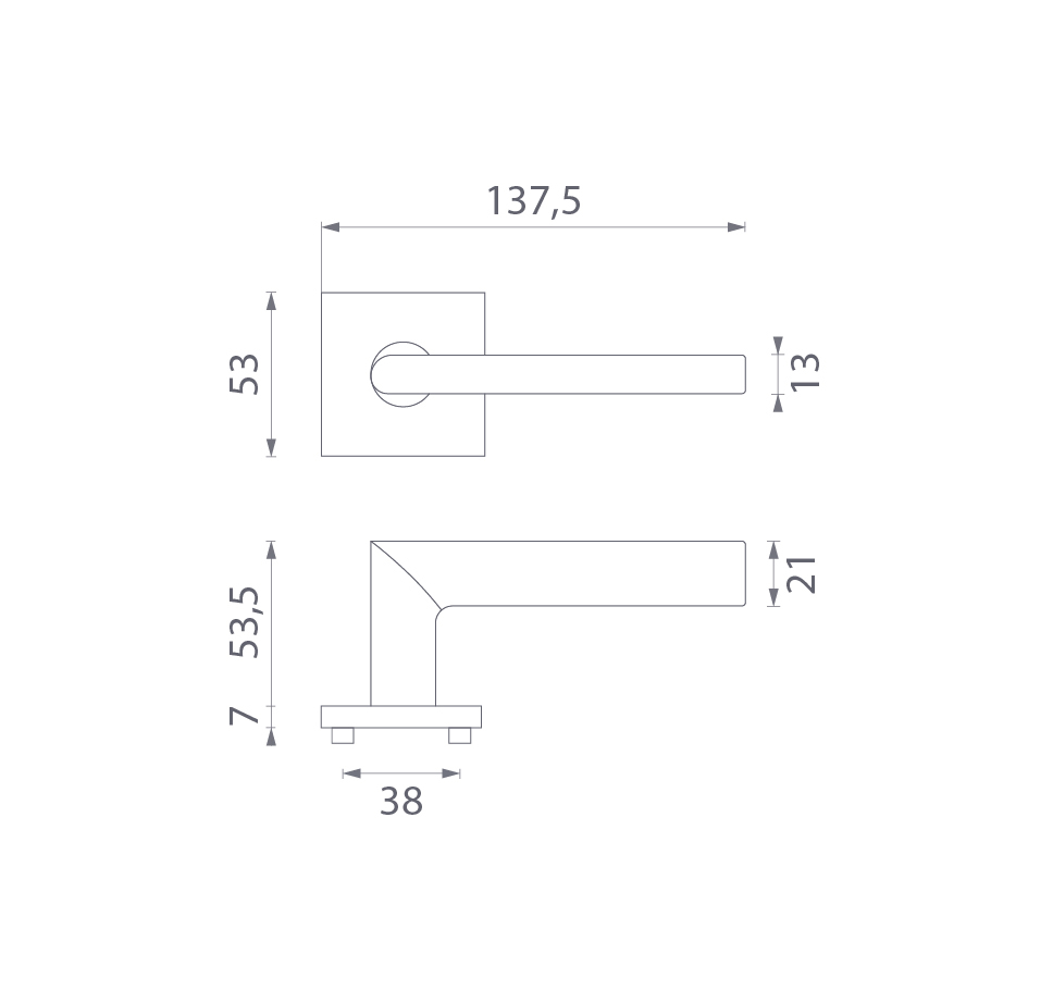Rozetová klika na interiérové dveře s hranatou rozetou je vyrobena z materiálů vysoké kvality - zamak a je povrchově upravena. Rozeta má rozměr 53x53 mm a tloušťku jen 7 mm. Minimalistický design rozety s vysokou stabilitou kliky na dveřích působí jemně, a tím ponechává prostor pro vyniknutí designu samotné kliky.