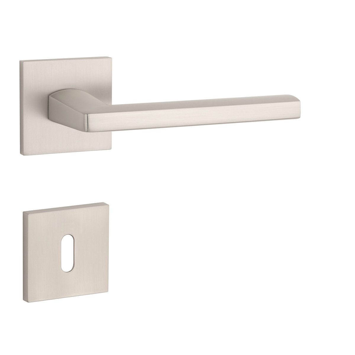 Rozetová klika na interiérové dveře s hranatou rozetou je vyrobena z materiálů vysoké kvality - zamak a je povrchově upravena. Rozeta má rozměr 52x52 mm a tloušťku jen 7 mm. Minimalistický design rozety s vysokou stabilitou kliky na dveřích působí jemně, a tím ponechává prostor pro vyniknutí designu samotné kliky.