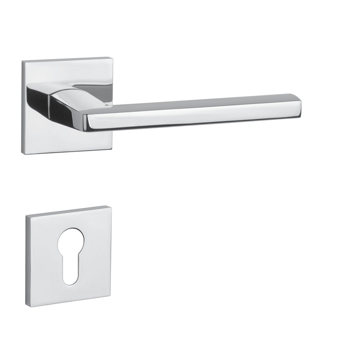 Rozetová klika na interiérové dveře s hranatou rozetou je vyrobena z materiálů vysoké kvality - zamak a je povrchově upravena. Rozeta má rozměr 52x52 mm a tloušťku jen 7 mm. Minimalistický design rozety s vysokou stabilitou kliky na dveřích působí jemně, a tím ponechává prostor pro vyniknutí designu samotné kliky.