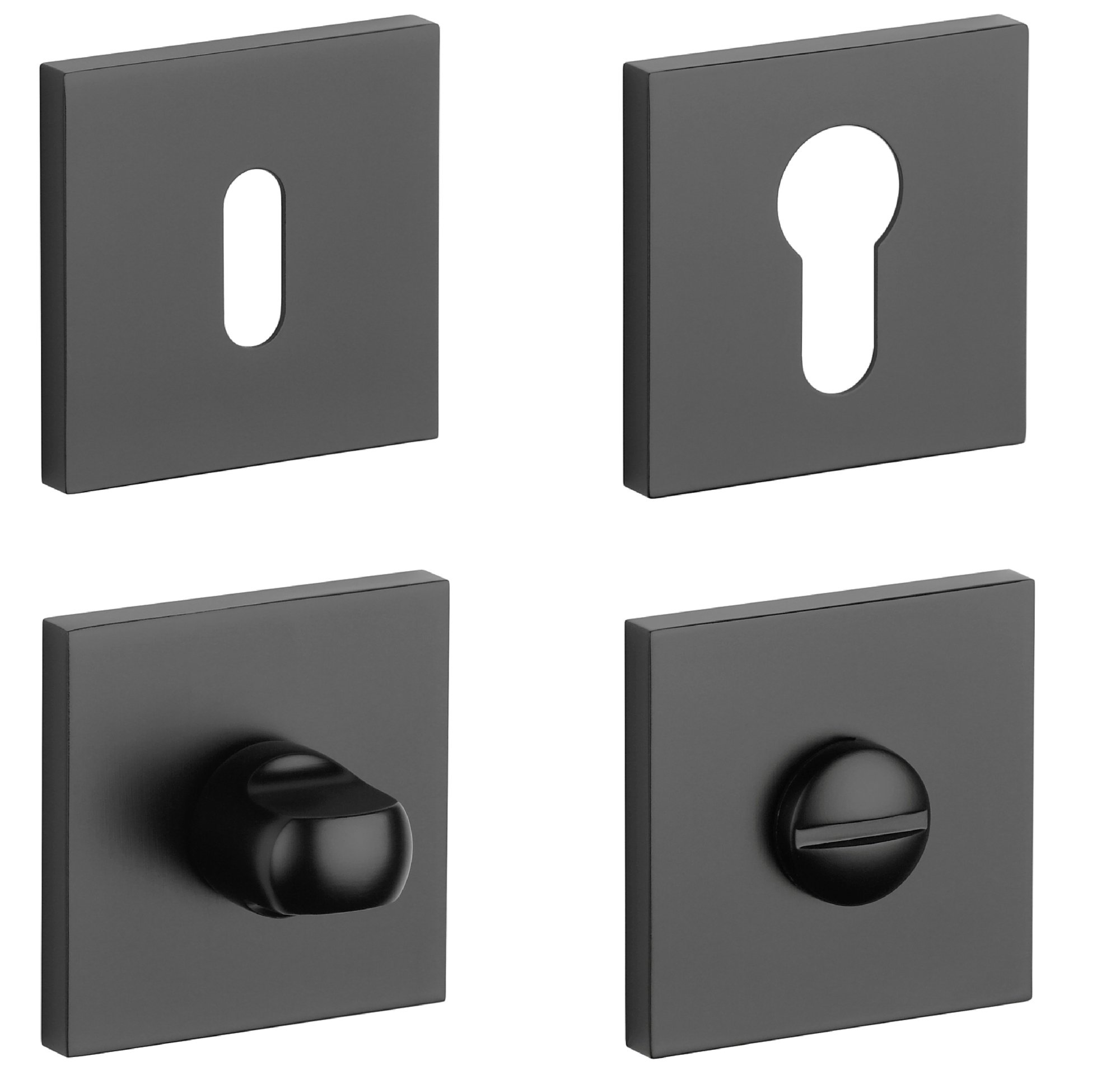 Hranatá rozeta je vyrobena z materiálů vysoké kvality - zamak a je povrchově upravena. Rozeta má rozměr 52x52 mm, tloušťku 7 mm a oválný otvor pro interiérový klíč (BB), otvor pro cylindrickou vložku (PZ), WC set s vmontovaným klíčem. Balení obsahuje 2 kusy rozet (pár) a rozety WC jsou v balení jako set.