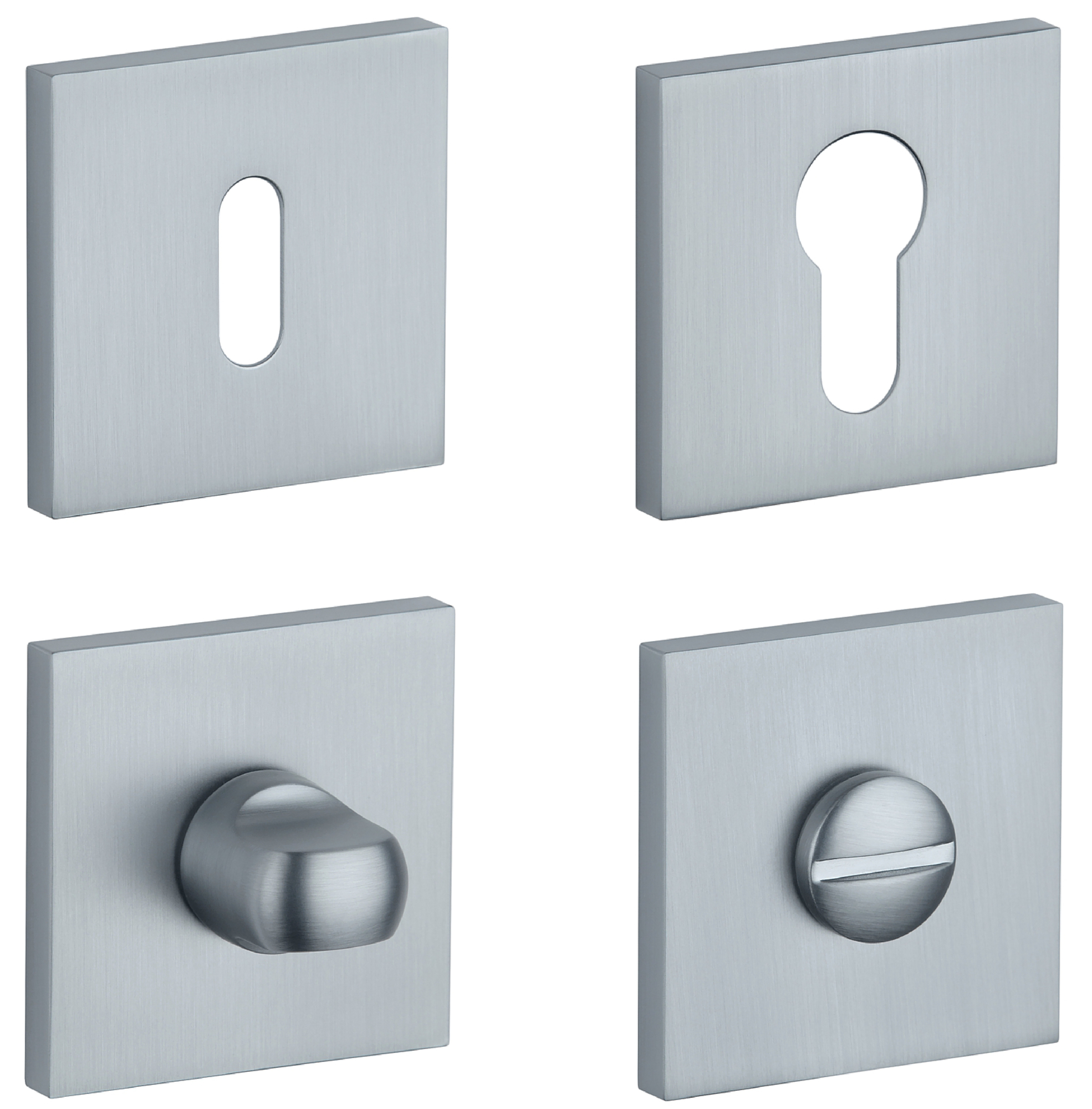 Hranatá rozeta je vyrobena z materiálů vysoké kvality - zamak a je povrchově upravena. Rozeta má rozměr 52x52 mm, tloušťku 7 mm a oválný otvor pro interiérový klíč (BB), otvor pro cylindrickou vložku (PZ), WC set s vmontovaným klíčem. Balení obsahuje 2 kusy rozet (pár) a rozety WC jsou v balení jako set.