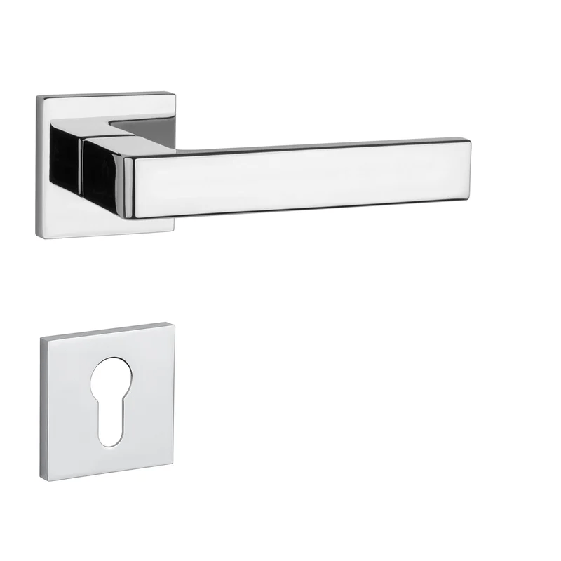 Rozetová klika na interiérové dveře s hranatou rozetou je vyrobena z materiálů vysoké kvality - zamak a je povrchově upravena. Rozeta má rozměr 52x52 mm a tloušťku jen 7 mm. Minimalistický design rozety s vysokou stabilitou kliky na dveřích působí jemně, a tím ponechává prostor pro vyniknutí designu samotné kliky.