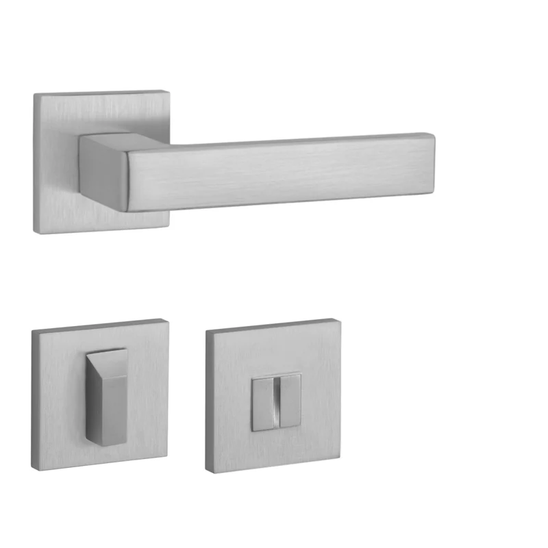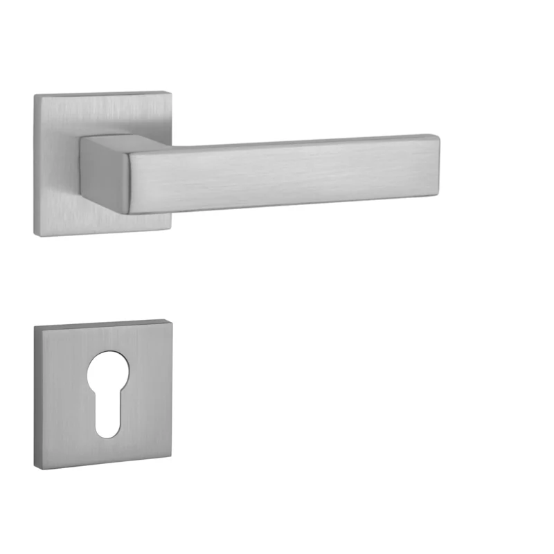 Rozetová klika na interiérové dveře s hranatou rozetou je vyrobena z materiálů vysoké kvality - zamak a je povrchově upravena. Rozeta má rozměr 52x52 mm a tloušťku jen 7 mm. Minimalistický design rozety s vysokou stabilitou kliky na dveřích působí jemně, a tím ponechává prostor pro vyniknutí designu samotné kliky.