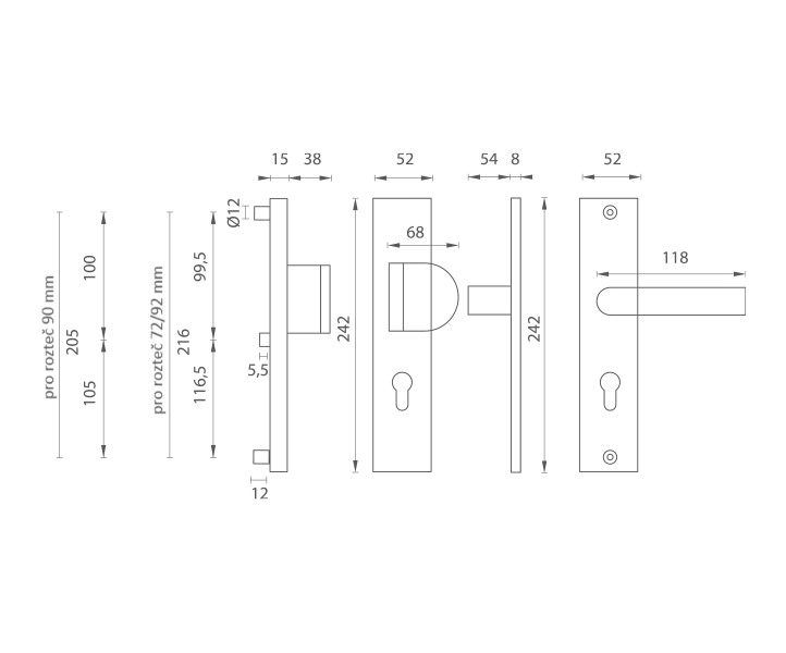 U bezpečnostního kování je třeba znát vzdálenost mezi osou kliky a osou klíče (rozteč). Standardní vzdálenost je 72, 90 nebo 92 mm. Kování s roztečí 72 a 90 mm je standardem pro tloušťku dveří od 38 mm do 50 mm. Kování s roztečí 92 mm je standardem pro tloušťku dveří od 68 mm do 78 mm.
