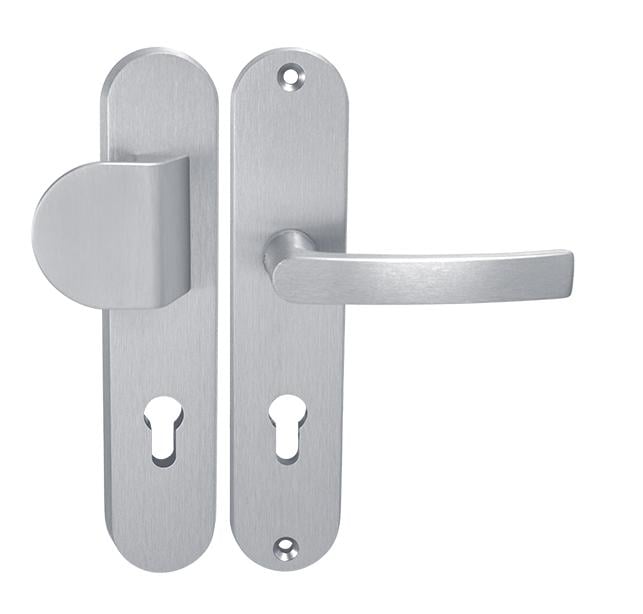 Štítová klika na vchodové a bezpečnostní dveře s bezpečnostním oválným štítem bez překrytí cylindrické vložky je vyrobena z hliníku a je povrchově upravena. Oválný štít má rozměry 52 mm x 242 mm a tloušťku 15 mm.