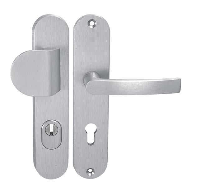 Štítová klika na vchodové a bezpečnostní dveře s bezpečnostním oválným štítem s překrytím cylindrické vložky je vyrobena z hliníku a je povrchově upravena. Oválný štít má rozměry 52 mm x 242 mm a tloušťku 15 mm.