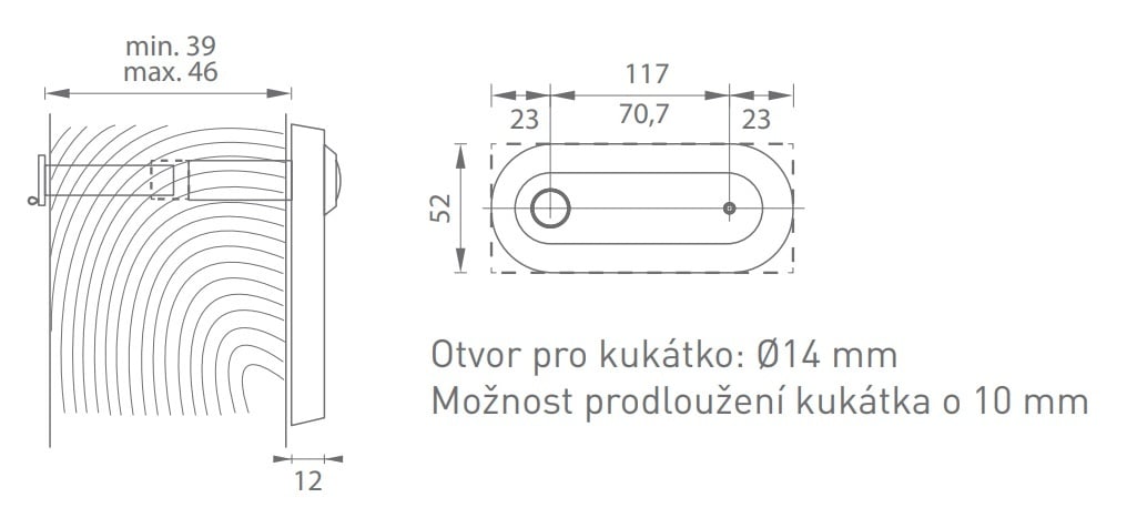 Dveřní kukátko se jmenovkou je vyrobeno z hliníku a je povrchově upraveno. Celkové rozměry kulatého kukátka se jmenovkou jsou 117 mm x 52 mm x 12 mm. Vhodné pro dveře o šířce min. 39 mm a max. 46 mm. Otvor pro kukátko: Ø14 mm. Možnost prodloužení kukátka o 10 mm. Na toto kukátko je prodloužená záruka 10 let.