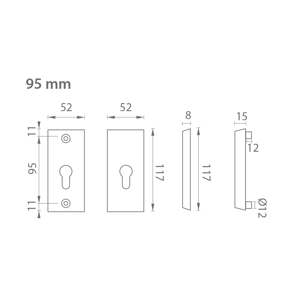Přídavná rozeta s PZ otvorem pro vložku se vzdáleností otvorů pro šrouby 95 mm má celkovou délku 117 mm a tloušťku 15 mm.