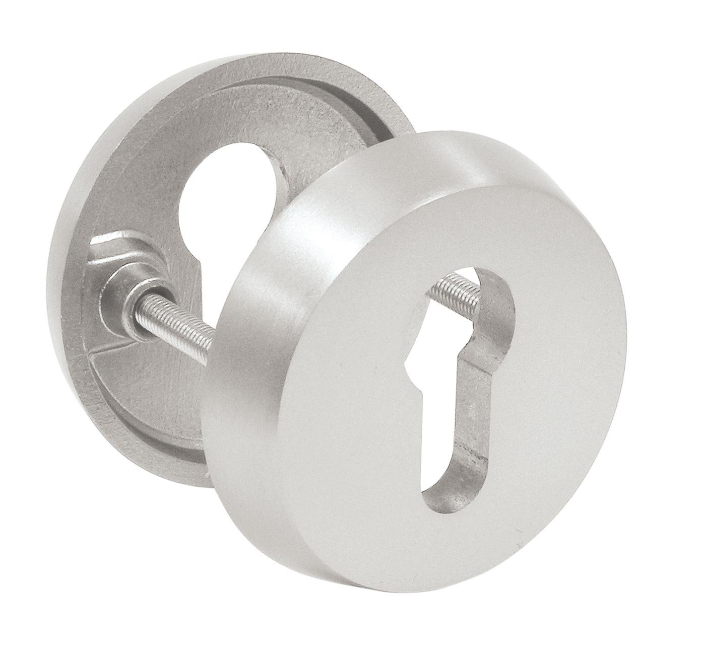 Bezpečnostní kulatá rozeta bez překrytí cylindrické vložky je vyrobena z hliníku a je povrchově upravena.
