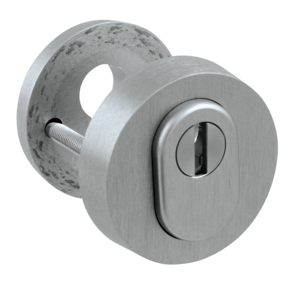 Bezpečnostní kulatá rozeta s překrytím cylindrické vložky je vyrobena z hliníku a je povrchově upravena.