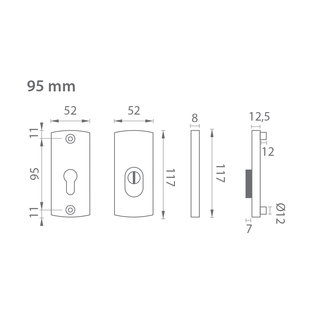 Přídavná rozeta s PZ PLUS otvorem pro vložku se vzdáleností otvorů pro šrouby 95 mm má celkovou délku 117 mm a tloušťku 15 mm.