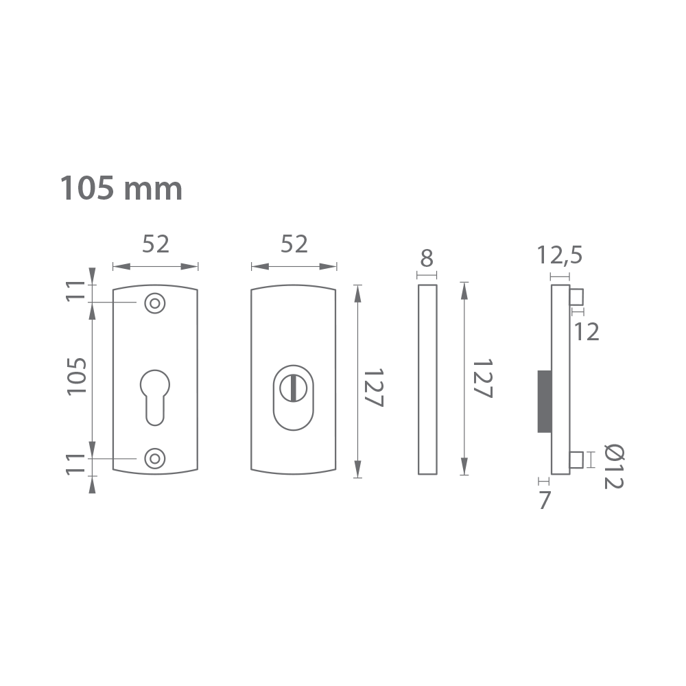 Přídavná rozeta s PZ PLUS otvorem pro vložku se vzdáleností otvorů pro šrouby 105 mm má celkovou délku 127 mm a tloušťku 15 mm.