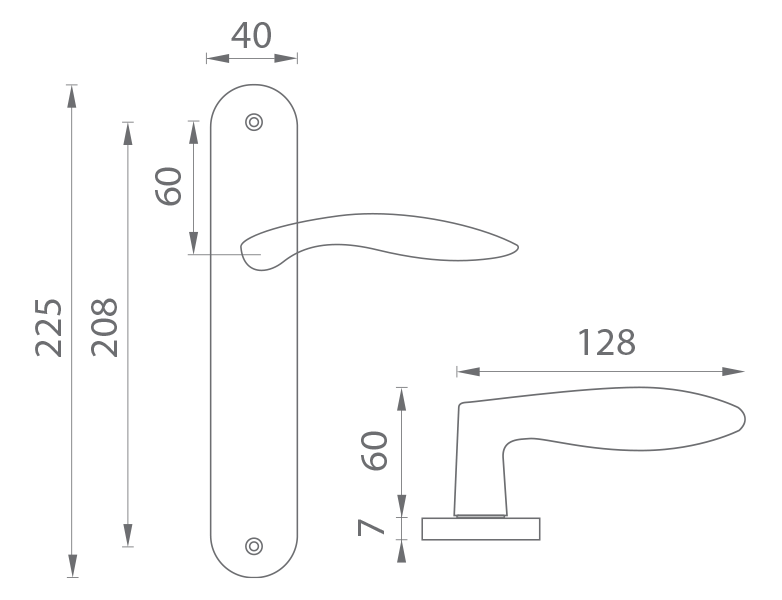 Štítová klika na interiérové dveře s oválným štítem je vyrobena z hliníku a je povrchově upravena. Oválný štít má rozměry 40 mm x 225 mm a klika neobsahuje vratný mechanismus.