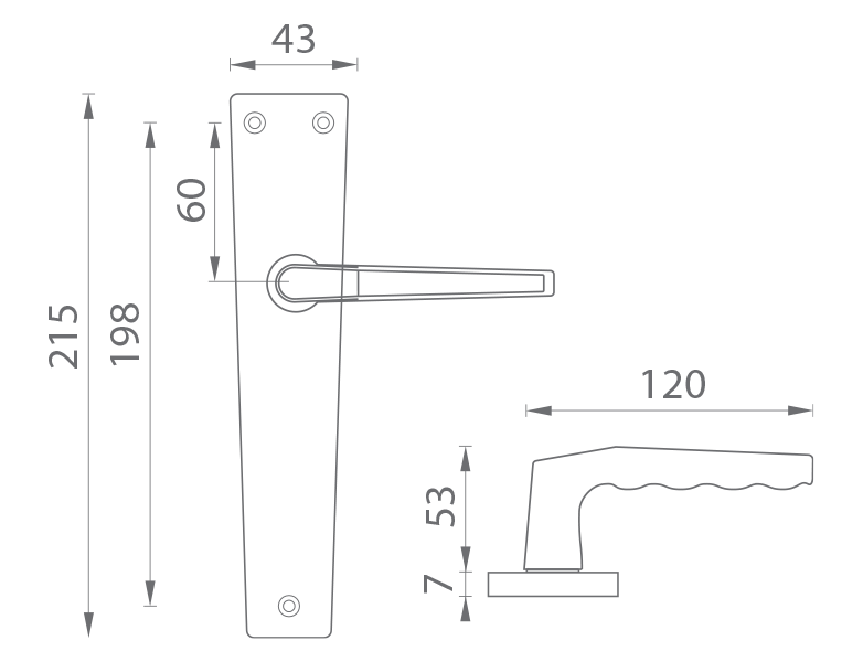Štítová klika na interiérové ​​dveře s hranatým štítem je vyrobena z hliníku a je povrchově upravena. Hranatý štít má rozměry 43 mm x 215 mm a klika neobsahuje vratný mechanismus.