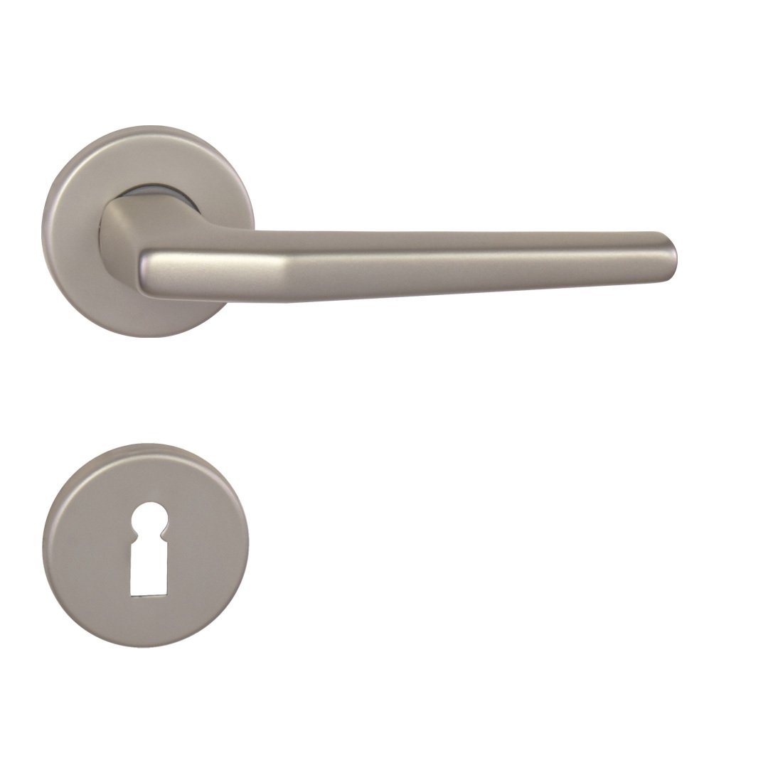 Rozetová klika na interiérové dveře s kulatou rozetou je vyrobena z hliníku a je povrchově upravena. Rozeta má průměr 50 mm a tloušťku 7 mm. Klika neobsahuje vratný mechanismus kliky – pružinu a mechanika kliky je uložená v plastovém pouzdře.