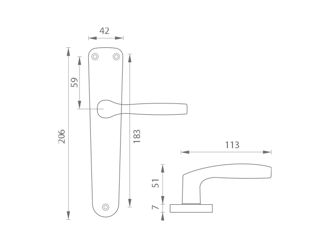 Štítová klika na interiérové dveře s oválným štítem je vyrobena z hliníku a je povrchově upravena. Oválný štít má rozměry 42 mm x 206 mm a klika neobsahuje vratný mechanismus.