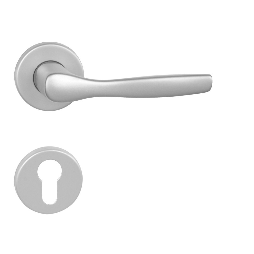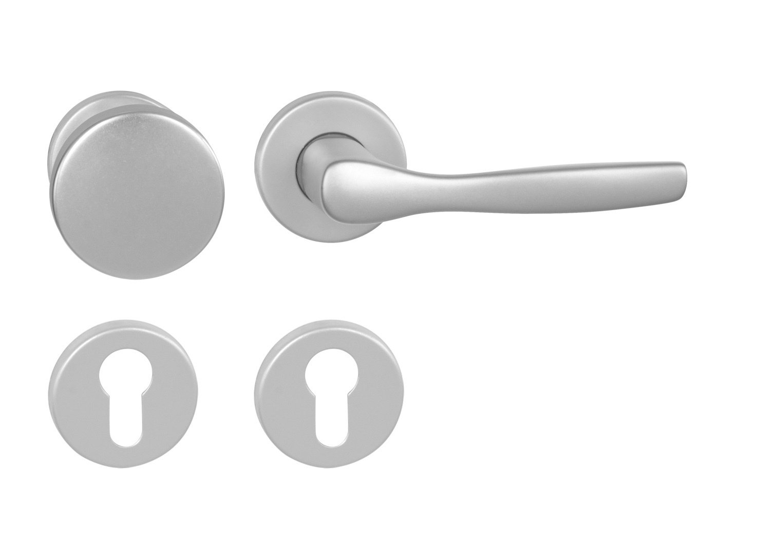 Rozetová klika na interiérové dveře s kulatou rozetou je vyrobena z hliníku a je povrchově upravena. Rozeta má průměr 50 mm a tloušťku 8 mm. Klika neobsahuje vratný mechanismus kliky – pružinu a mechanika kliky je uložená v plastovém pouzdře.