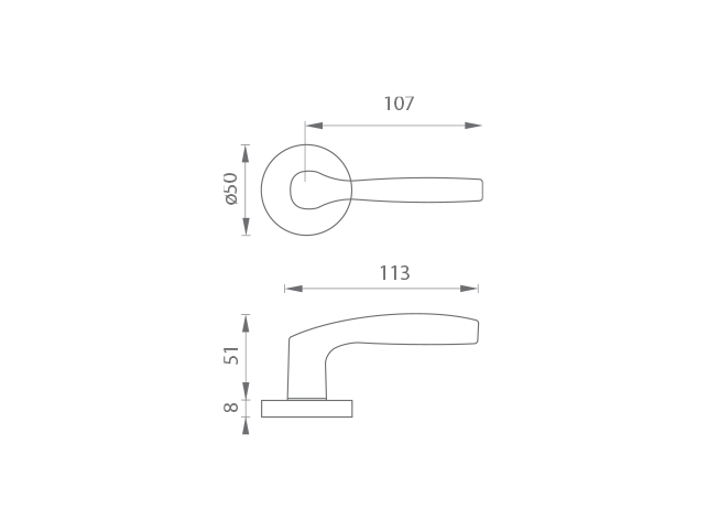 Rozetová klika na interiérové dveře s kulatou rozetou je vyrobena z hliníku a je povrchově upravena. Rozeta má průměr 50 mm a tloušťku 8 mm. Klika neobsahuje vratný mechanismus kliky – pružinu a mechanika kliky je uložená v plastovém pouzdře.
