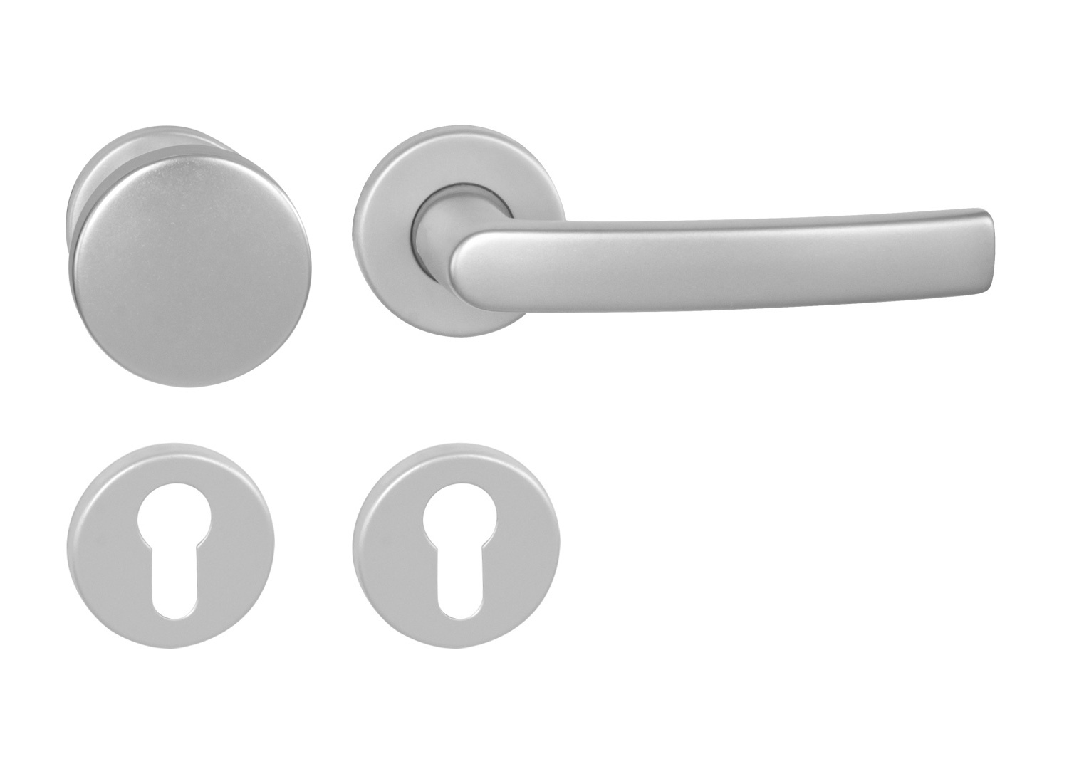 Rozetová klika na interiérové dveře s kulatou rozetou je vyrobena z hliníku a je povrchově upravena. Rozeta má průměr 50 mm a tloušťku 7 mm. Klika neobsahuje vratný mechanismus kliky – pružinu a mechanika kliky je uložena v plastovém pouzdře.