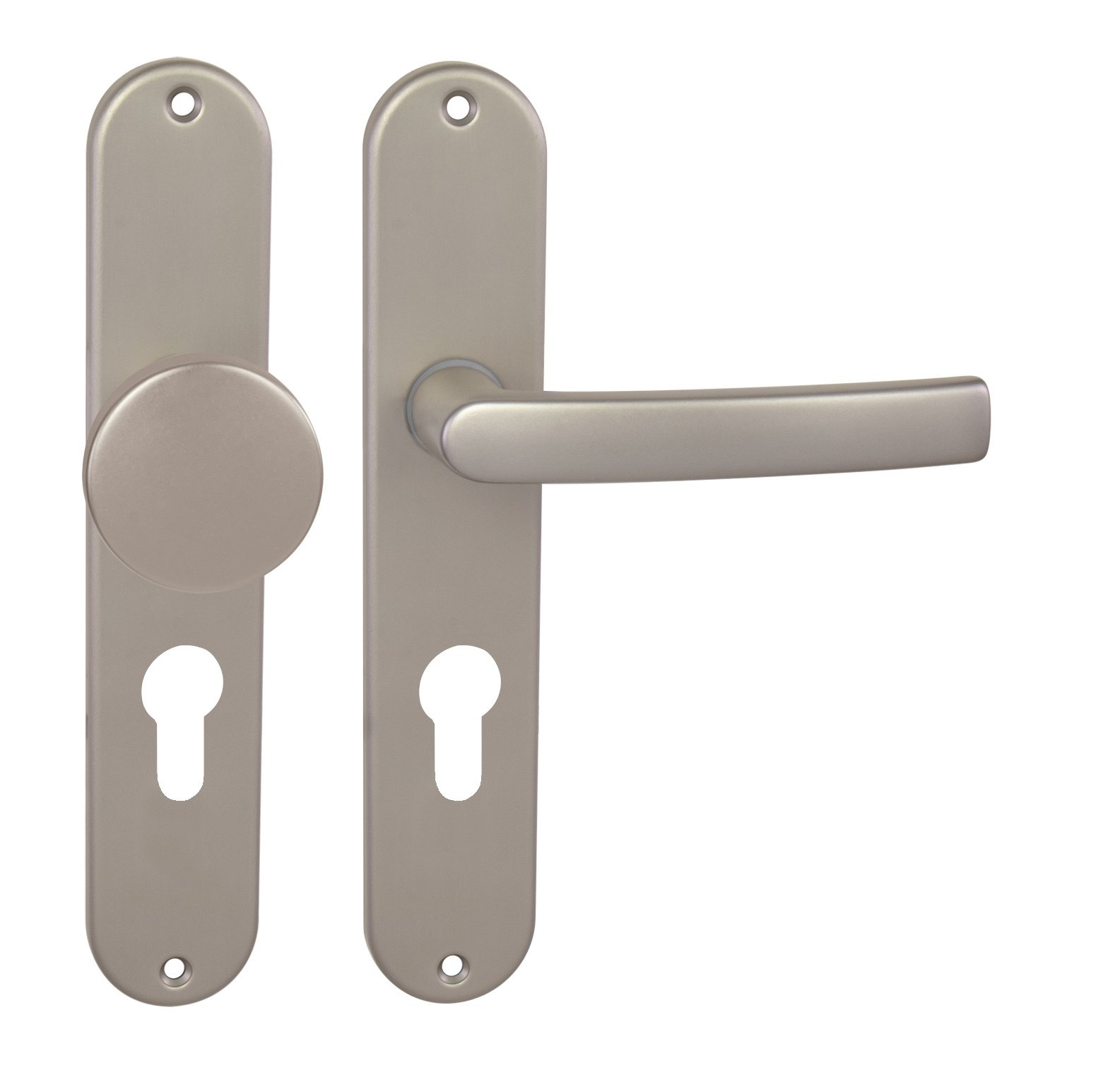 Štítová klika na interiérové dveře s oválným štítem je vyrobena z hliníku a je povrchově upravena. Oválný štít má rozměry 40 mm x 225 mm a klika neobsahuje vratný mechanismus.