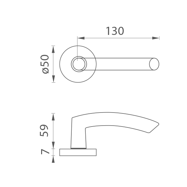 Rozetová klika na interiérové dveře s kulatou rozetou je vyrobená z hliníku a je povrchově upravená. Rozeta má průměr 50 mm a tloušťku 7 mm. Klika neobsahuje vratný mechanismus kliky – pružinu a mechanika kliky je uložená v plastovém pouzdře.