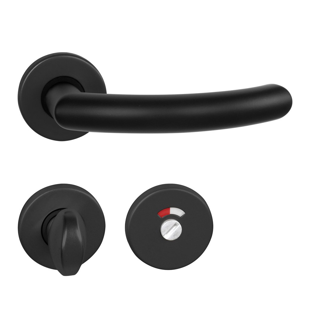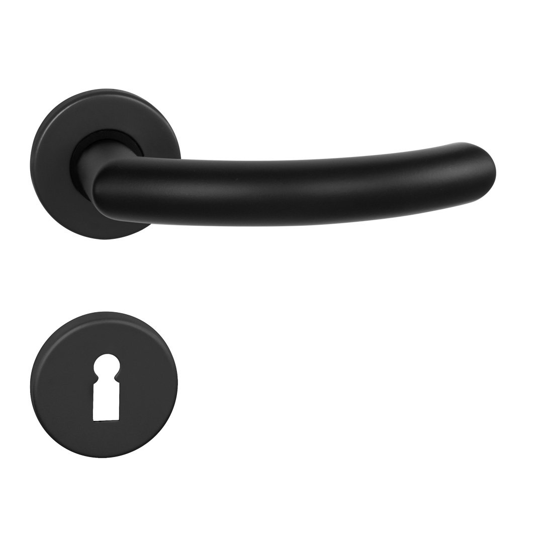 Rozetová klika na interiérové dveře s kulatou rozetou je vyrobená z hliníku a je povrchově upravená. Rozeta má průměr 50 mm a tloušťku 7 mm. Klika neobsahuje vratný mechanismus kliky – pružinu a mechanika kliky je uložená v plastovém pouzdře.