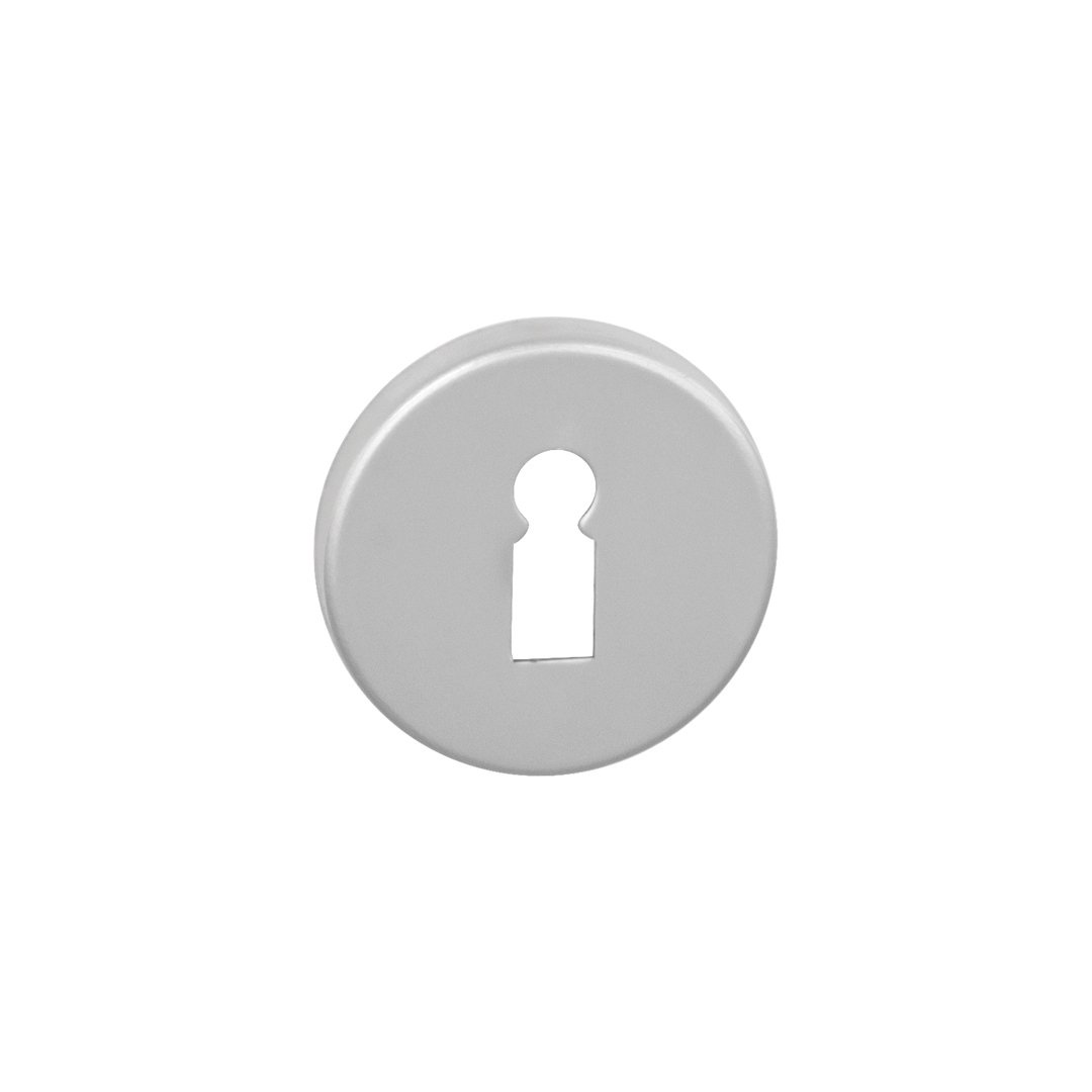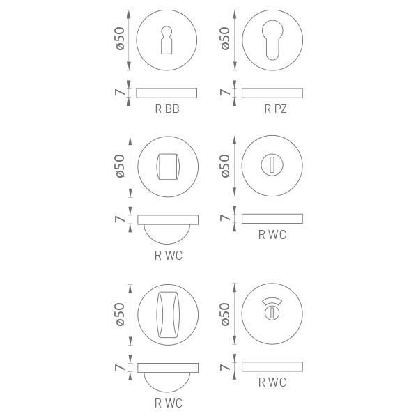 Kulatá rozeta je vyrobena z hliníku a je povrchově upravena. Rozeta má průměr 50 mm, tloušťku 7 mm a oválný otvor pro interiérový klíč (BB), otvor pro cylindrickou vložku (PZ) , WC set s vmontovaným klíčem a ukazovatelem. Balení obsahuje 2 kusy rozet (pár) a rozety WC jsou v balení jako set.