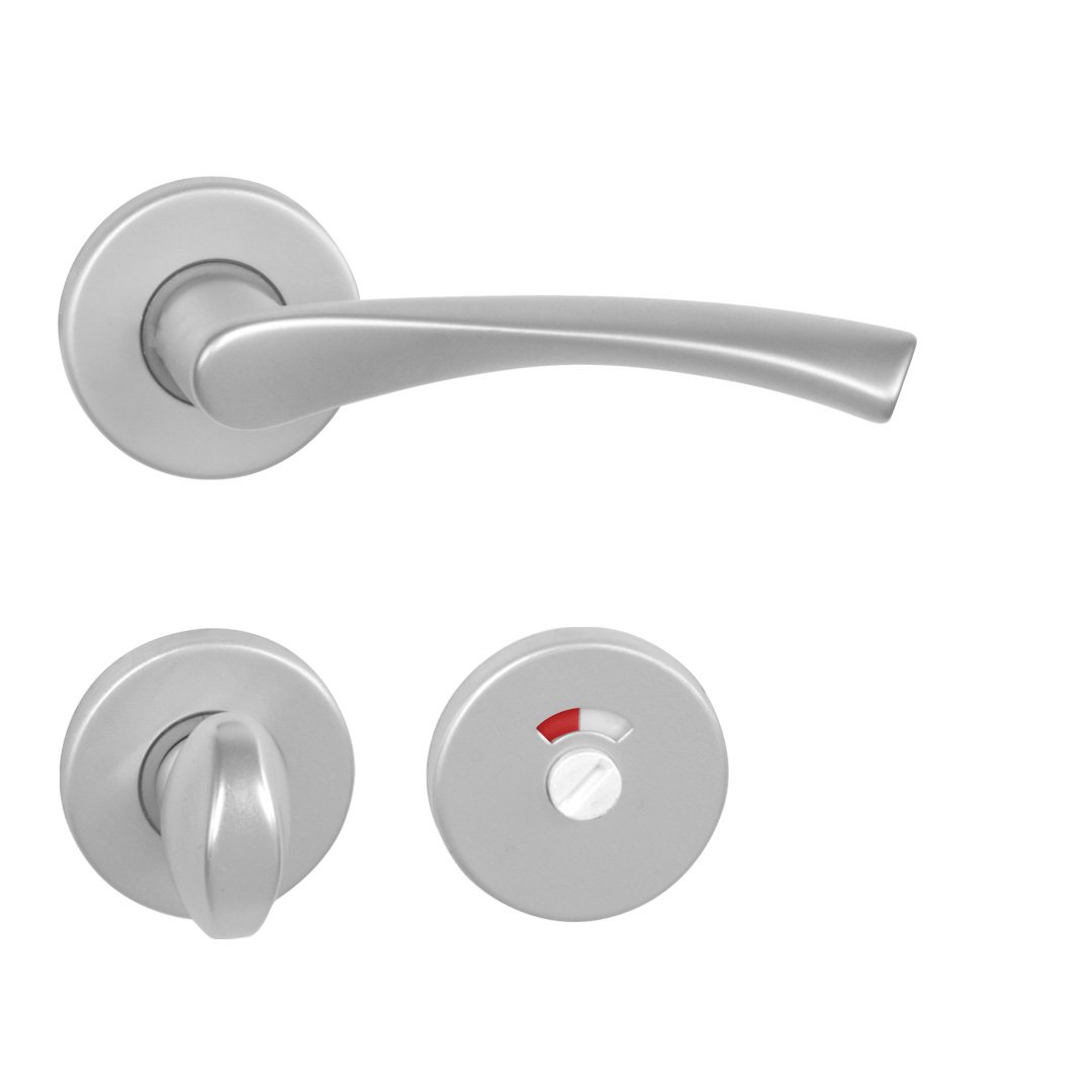 Rozetová klika na interiérové ​​dveře s kulatou rozetou je vyrobena z hliníku a je povrchově upravena. Rozeta má průměr 50 mm a tloušťku 7 mm. Klika neobsahuje vratný mechanismus kliky – pružinu a mechanika kliky je uložená v plastovém pouzdře.