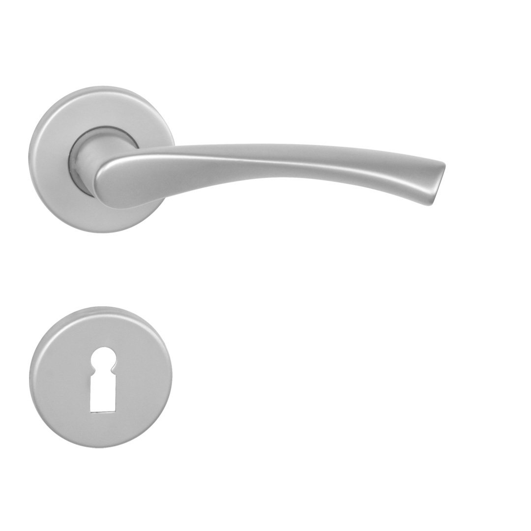 Rozetová klika na interiérové ​​dveře s kulatou rozetou je vyrobena z hliníku a je povrchově upravena. Rozeta má průměr 50 mm a tloušťku 7 mm. Klika neobsahuje vratný mechanismus kliky – pružinu a mechanika kliky je uložená v plastovém pouzdře.