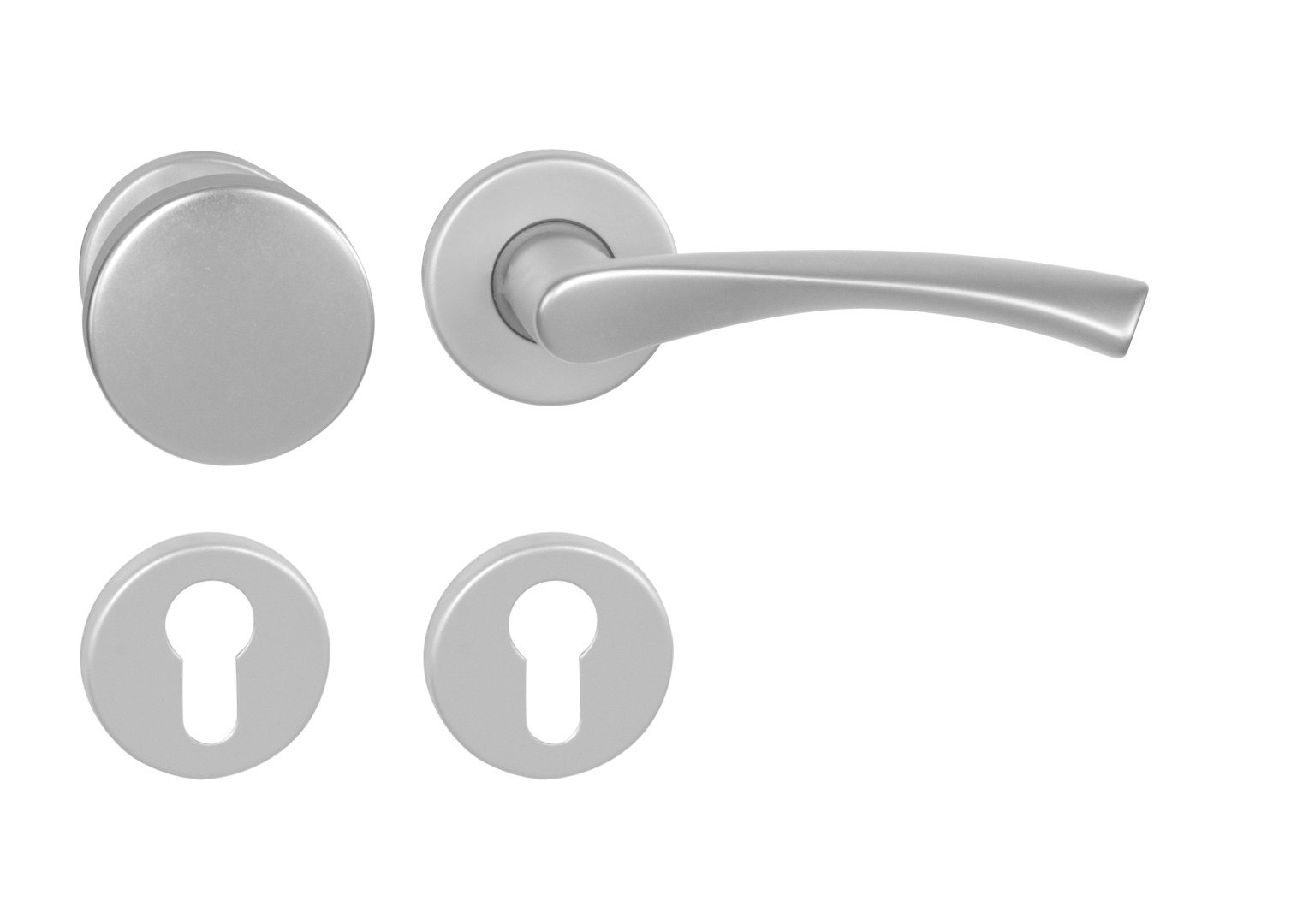 Rozetová klika na interiérové ​​dveře s kulatou rozetou je vyrobena z hliníku a je povrchově upravena. Rozeta má průměr 50 mm a tloušťku 7 mm. Klika neobsahuje vratný mechanismus kliky – pružinu a mechanika kliky je uložená v plastovém pouzdře.