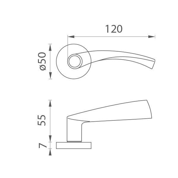 Rozetová klika na interiérové ​​dveře s kulatou rozetou je vyrobena z hliníku a je povrchově upravena. Rozeta má průměr 50 mm a tloušťku 7 mm. Klika neobsahuje vratný mechanismus kliky – pružinu a mechanika kliky je uložená v plastovém pouzdře.