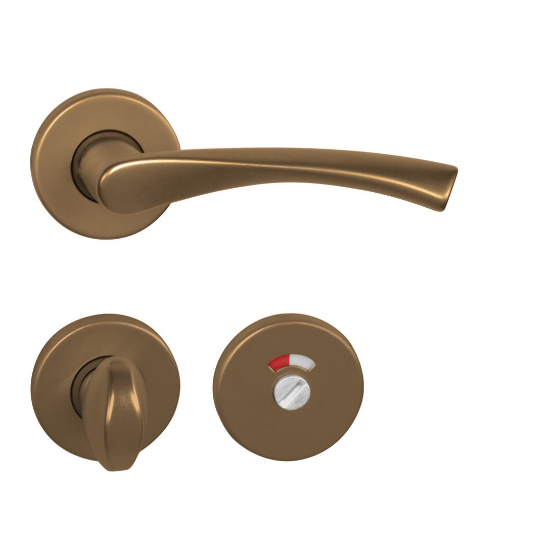 Rozetová klika na interiérové ​​dveře s kulatou rozetou je vyrobena z hliníku a je povrchově upravena. Rozeta má průměr 50 mm a tloušťku 7 mm. Klika neobsahuje vratný mechanismus kliky – pružinu a mechanika kliky je uložená v plastovém pouzdře.