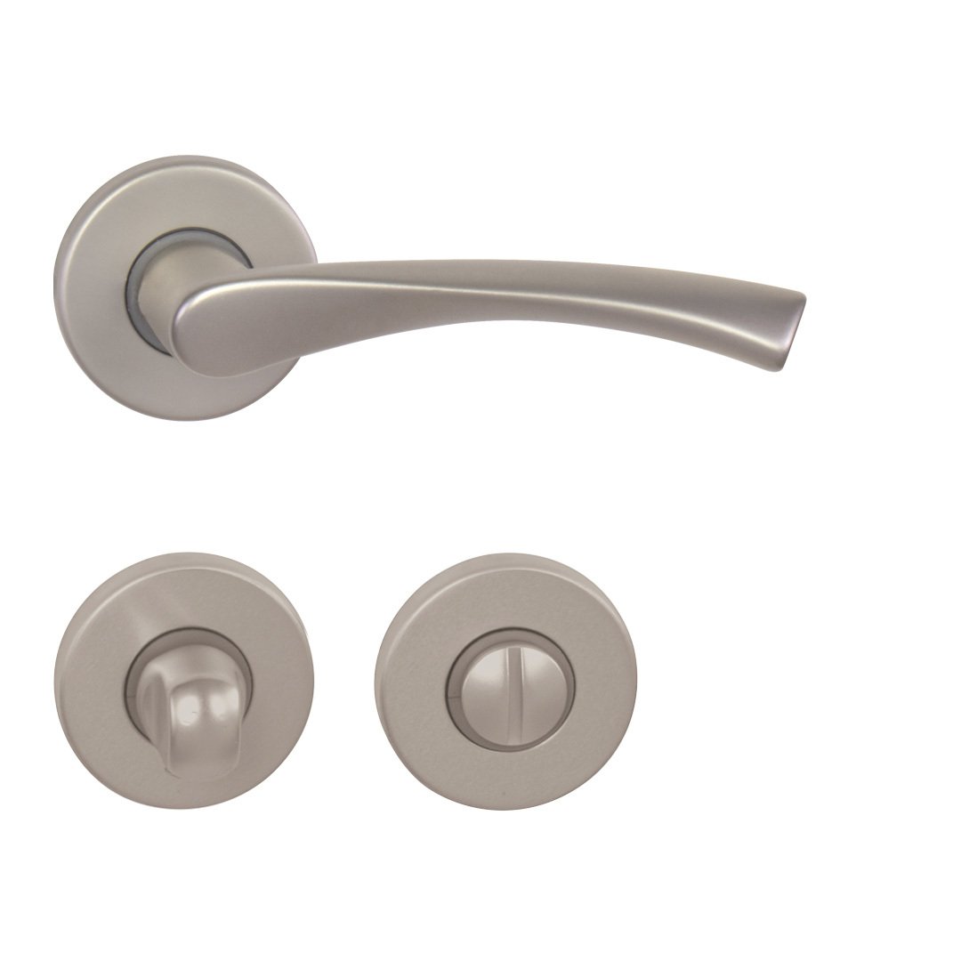 Rozetová klika na interiérové dveře s kulatou rozetou je vyrobena z hliníku a je povrchově upravena. Rozeta má průměr 50 mm a tloušťku 7 mm. Klika neobsahuje vratný mechanismus kliky – pružinu a mechanika kliky je uložená v plastovém pouzdře.