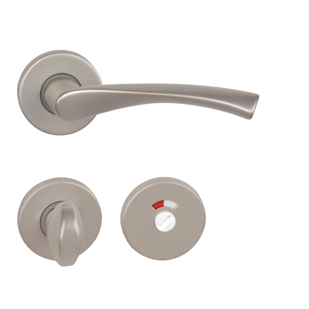 Rozetová klika na interiérové dveře s kulatou rozetou je vyrobena z hliníku a je povrchově upravena. Rozeta má průměr 50 mm a tloušťku 7 mm. Klika neobsahuje vratný mechanismus kliky – pružinu a mechanika kliky je uložená v plastovém pouzdře.