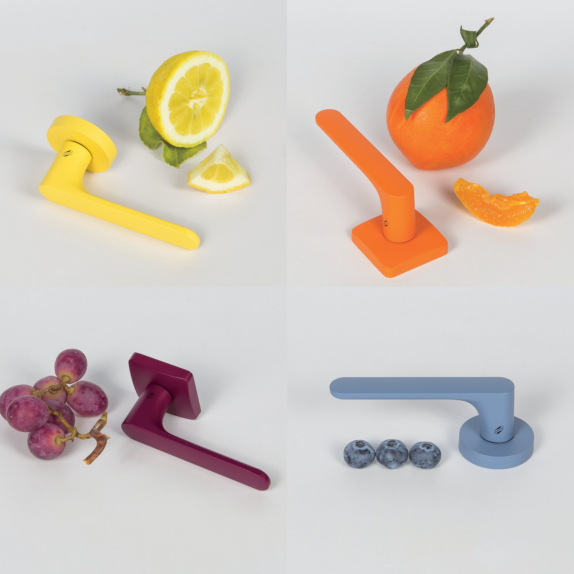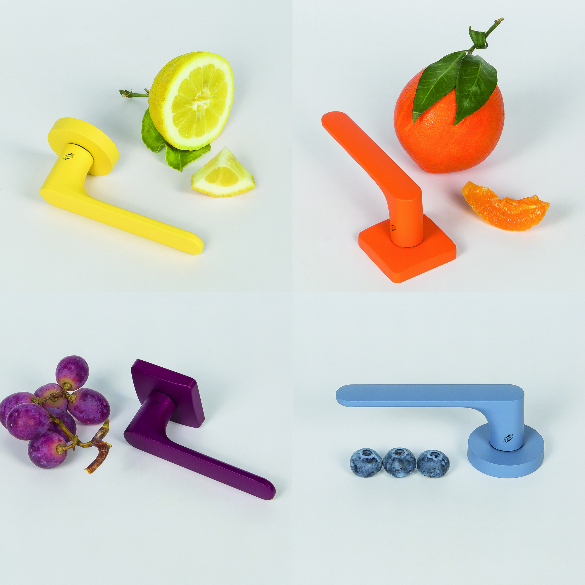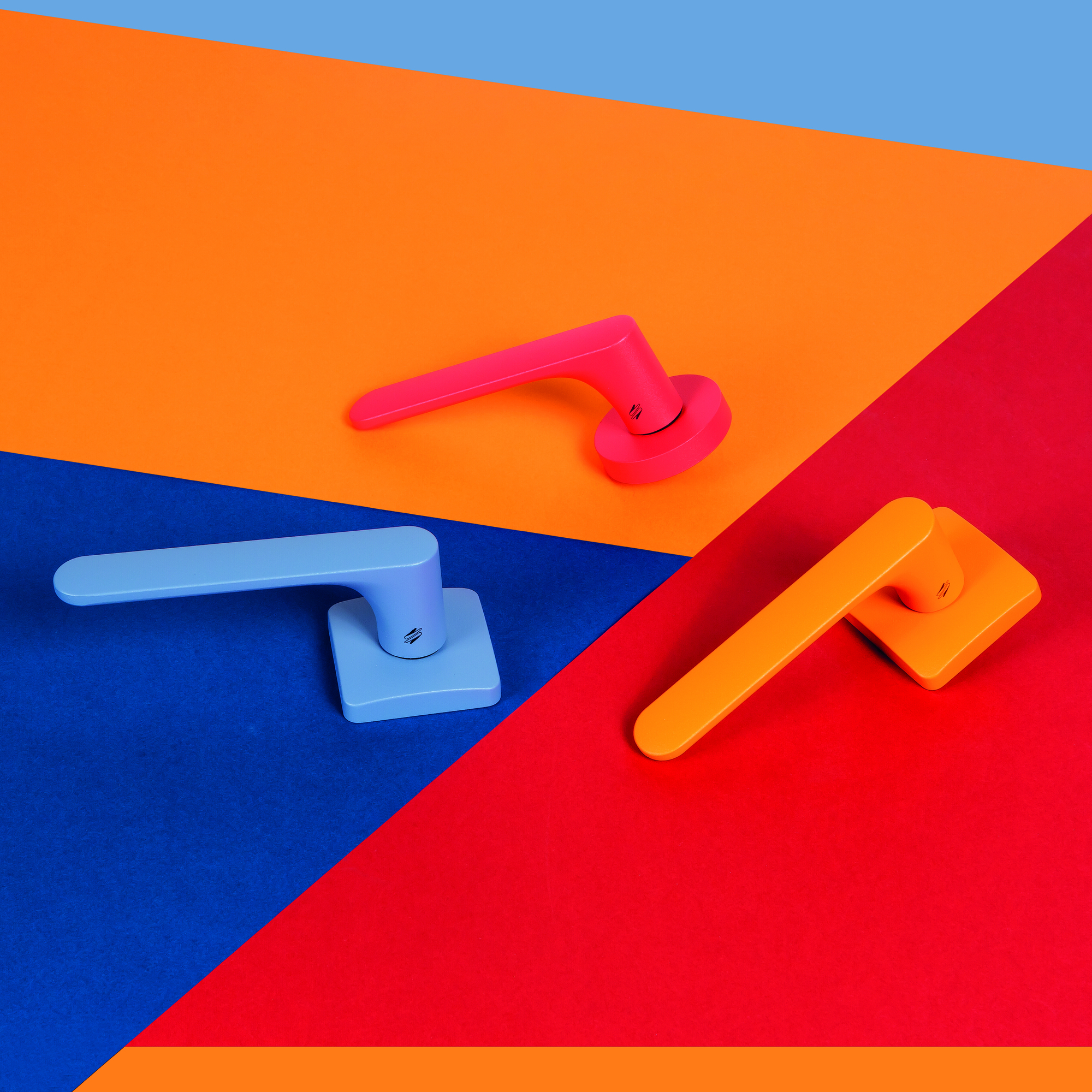 Minimalistický design rozety dává prostor pro vyniknutí výrazné barvy samotné kliky.