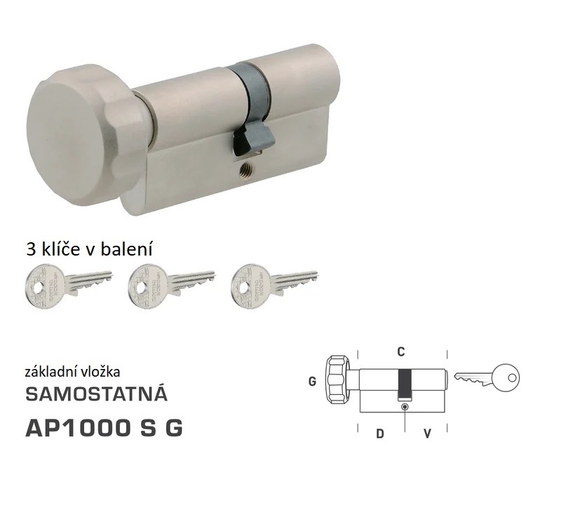 Precizní zpracování a kvalitní materiály zaručují dlouhou životnost a funkčnost oboustranné cylindrické bezpečnostní vložky AP1000 S G (s knoflíkem).