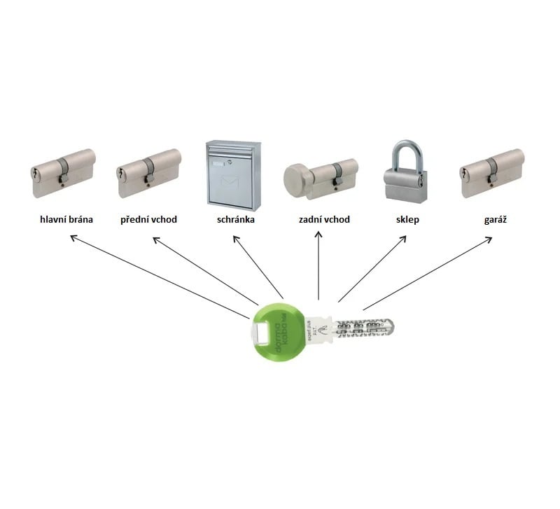 Při sjednocení čtyř vložek je potřeba připočítat 3x cenu sjednocení a zákazník dostane 3 nebo 5 vlastních klíčů pro celý systém podle vybrané bezpečnostní vložky. Sjednocení vložek na společný klíč je možné jen v rámci jednoho typu vložky.