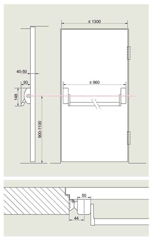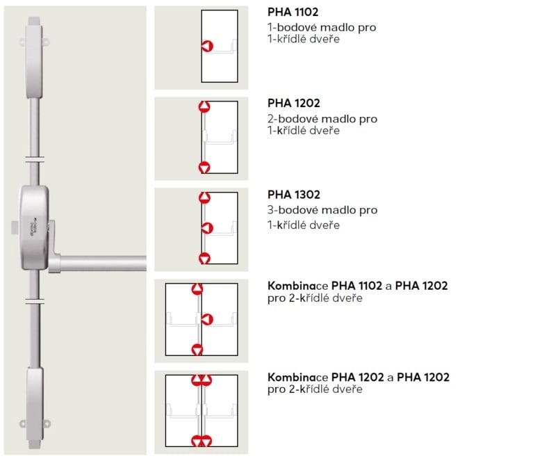 1-bodové panikové kování pro 1-křídlé dveře na únikových cestách.