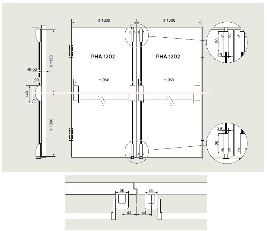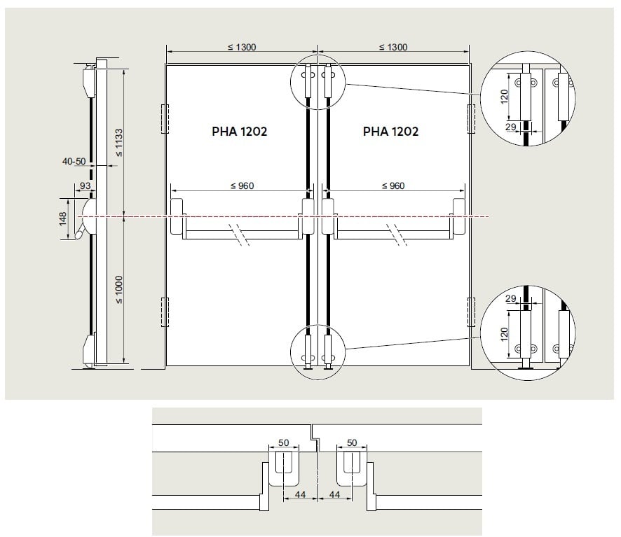 4-bodové panikové kování pro 2-křídlé dveře na únikových cestách.