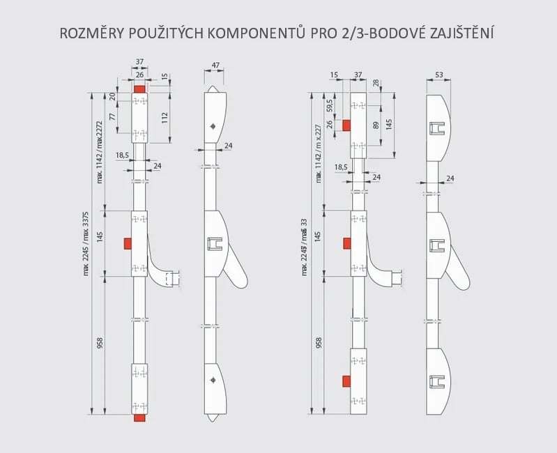 1-bod horizontální uzamykání, 2 body vertikální uzamykání.