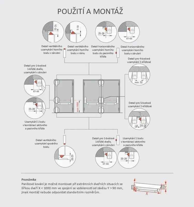 Tyto kování se montují na dveře, která jsou součástí nouzových východů a protipožárních únikových cest.