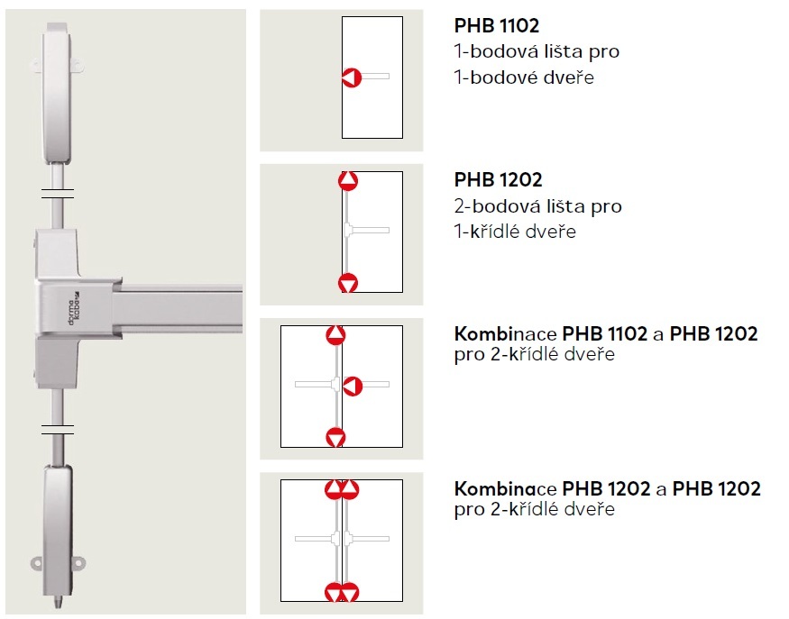 Tyto kování se montují na dveře, která jsou součástí nouzových východů a protipožárních únikových cest.