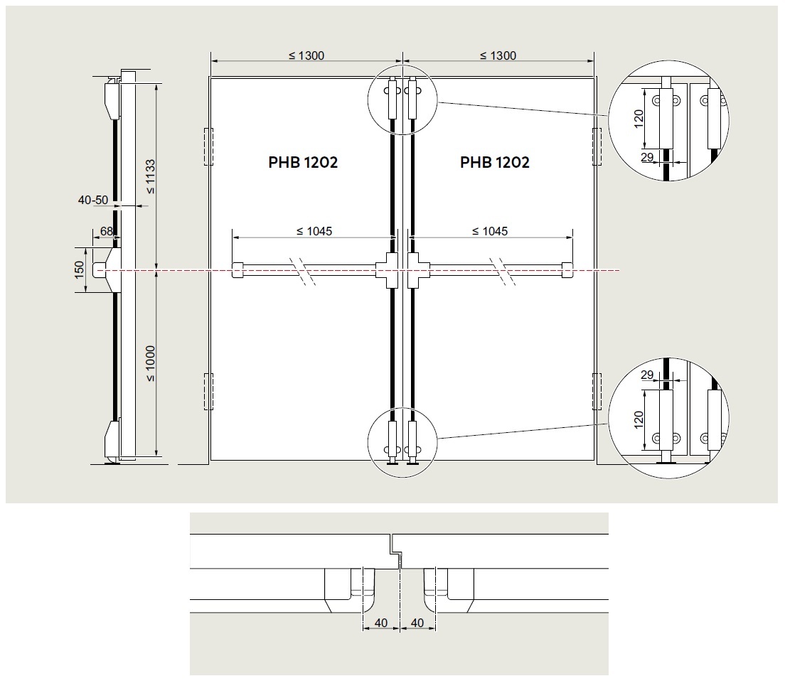 4-bodové panikové kování pro 2-křídlé dveře na únikových cestách.