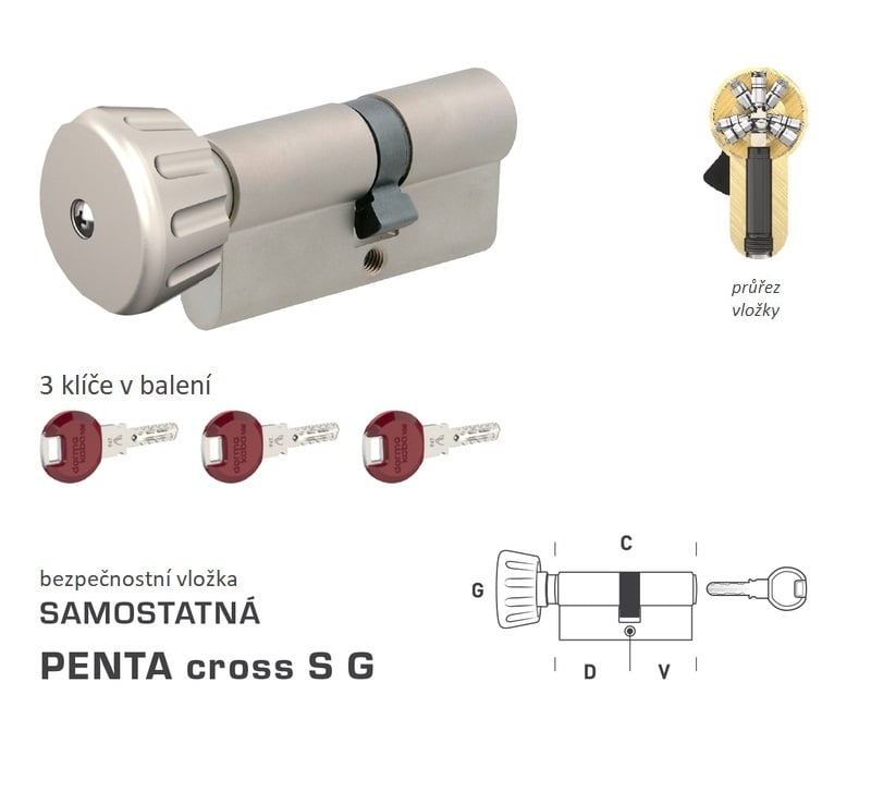 PENTA cross S G je samostatná bezpečnostní vložka s možností sjednocení více vložek na společný klíč.