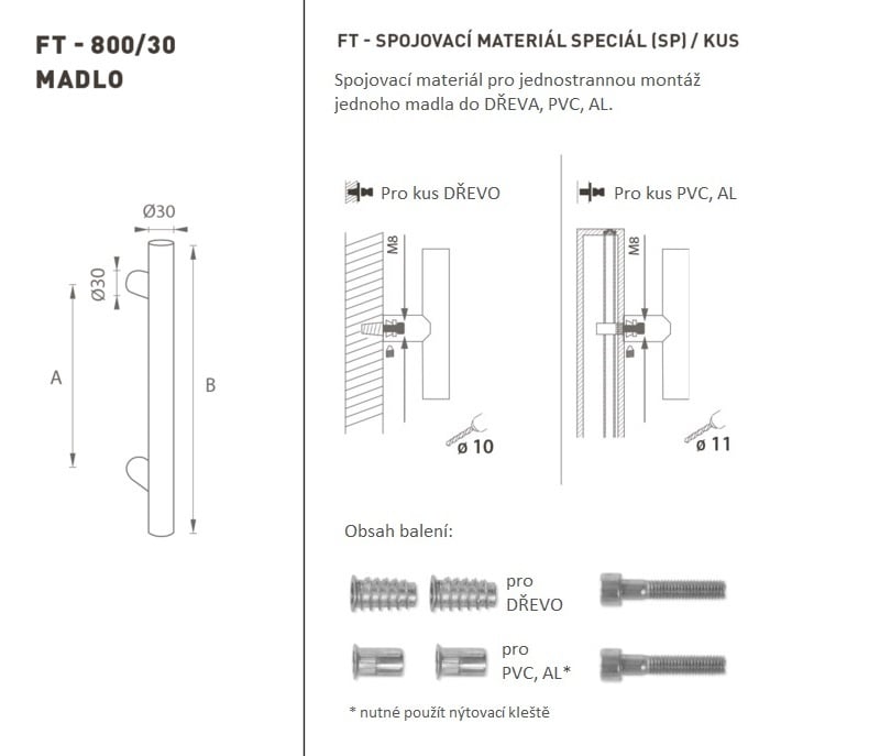 Madlo na dveře je vyrobeno z vysoce kvalitní nerezavějící oceli, známé jako nerez a je povrchově upraveno. Profil madla je 30 mm. Sada SPECIÁL (SP) obsahuje spojovací materiál pro jednostrannou montáž jednoho madla do dřeva, PVC, AL. Madlo s délkou 1600, 1800 a 2000 mm má 3 úchyty.